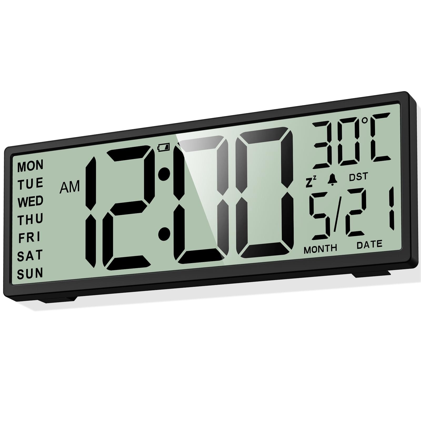 WallarGe Large Digital LED Wall Clock — Auto DST, Indoor Temp + Date & Day Display, 5-Level Brightness